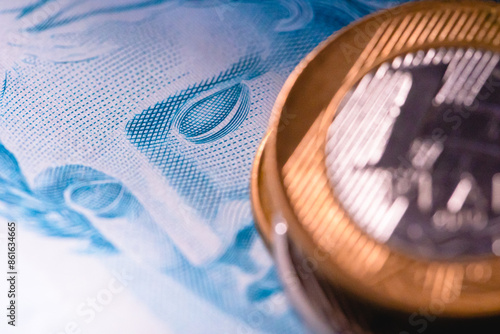 >Naklejka na meble>Real - Brl, 100 reais. Visão macro de uma nota de 100 reais com uma pilha de moedas de 1 real. Dívida, débito, imposto, sonegação, selic, juros.
