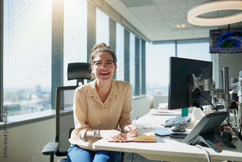 Fototapeta - Woman, notebook and desk with portrait, smile and pen with sunlight in office for finance manager. Accountant, budget and bookkeeping for audit or tax in company, professional and female person