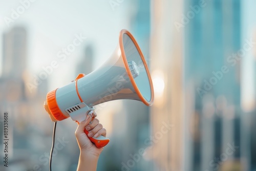 Fototapeta - Hand holding a megaphone with a cityscape background, perfect for announcements or promotional purposes.