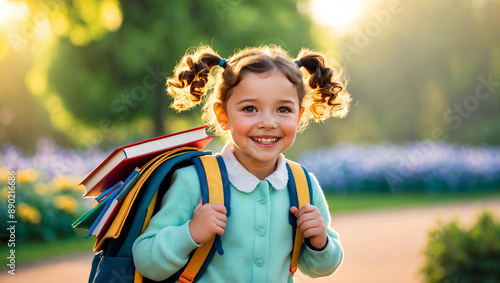 Fototapeta - piękna mała uczennica, skąpana w ciepłym, złotym porannym świetle, idąca do szkoły z ładunkiem kolorowych książek szkolnych i jasnym, promiennym uśmiechem na różowych policzkach