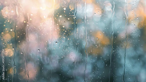 Misty raindrops on windowpane refracting soft morning light tranquil background