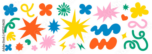 Fototapeta - Abstract clouds and flowers shapes sticker set. Groovy funky flowers, bubbles, stars, loops and waves in trendy retro cartoon style. Illustration with wavy elements