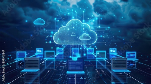 Fototapeta - Cloud Computing A cloud icon connected to various devices like laptops, tablets, and servers through a network of lines, with clear space around the graphic for text