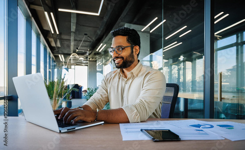 Fototapeta - A smiling young man in a suit sits in the office at a desk and works on a laptop, typing on a keyboard, texting, working with data