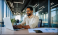 A smiling young man in a suit sits in the office at a desk and works on a laptop, typing on a keyboard, texting, working with data