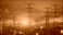>Naklejka na meble>Silhouette of power lines against a sunset sky, with glowing dots depicting the flow of electricity. The image represents the power infrastructure and the interconnectedness of the electrical grid.