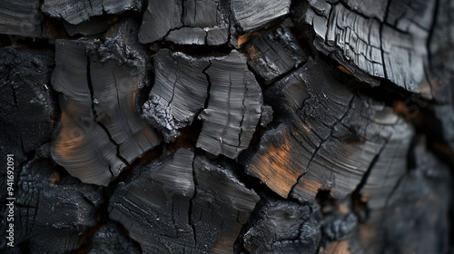 Fototapeta - Szczegółowe ujęcie stosu drewna z przypalonymi, pękniętymi teksturami, ujawniające szczegóły słoi drewna i wypaloną powierzchnię w otoczeniu na świeżym powietrzu.