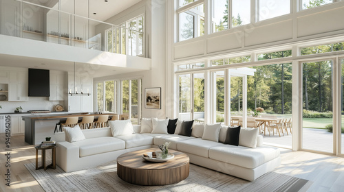 >Naklejka na meble>Wnętrze nowoczesnego salonu w luksusowym domu z otwartym planem pokazuje kuchnię, jadalnię i ścianę okien, która zapewnia oszałamiający widok na zewnętrzny krajobraz.
