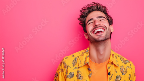 Fototapeta - Przystojny mężczyzna, w jasnych, kolorowych ubraniach, uśmiecha się szeroko i śmieje się, tworząc promienny obraz na tle jednolitym.