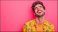 Przystojny mężczyzna, w jasnych, kolorowych ubraniach, uśmiecha się szeroko i śmieje się, tworząc promienny obraz na tle jednolitym.