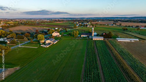 >Naklejka na meble>The view captures a peaceful rural community with expansive fields, scattered homes, and a silvery sunset. The rich greenery and orderly agricultural layout highlight the area serenity.