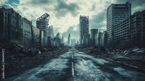 Fototapeta - Postapokaliptyczne miasto z wyraźnymi oznakami zniszczenia, w tym zrujnowane budynki, uszkodzone drogi i eksplodowane wieżowce.