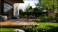>Naklejka na meble>Przestronna strefa patio w ogrodzie z dobrze utrzymanym drewnianym tarasem. Deski drewniane na podłodze oferują eleganckie wykończenie, a całość otaczają rośliny i elementy zieleni.