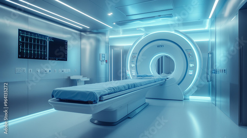 >Naklejka na meble>Nowoczesna sala tomografii komputerowej, gdzie centralnym punktem jest zaawansowane technologicznie urządzenie CT. Wnętrze jest jasne, przestronne i dobrze zorganizowane.