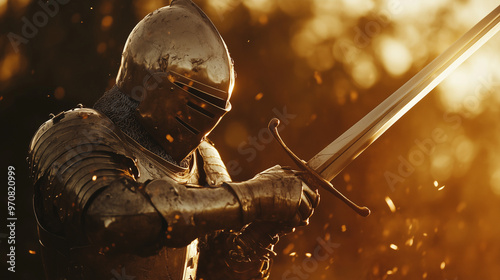 Fototapeta - Rycerz w lśniącej zbroi stoi na straży, unosząc miecz ponad głową. Jego błyszczące uzbrojenie i zdecydowany gest świadczą o sile i honorze.