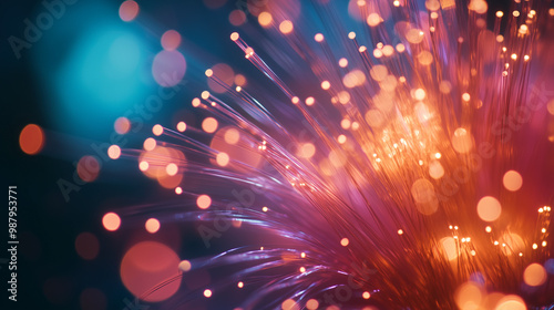 Efektowna kompozycja przedstawiająca jasne włókna optyczne, które wiją się i rozpraszają światło.