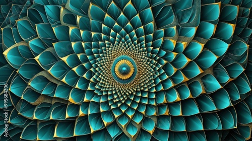 Abstract fractal pattern with teal and gold geometric spiral design in digital artwork