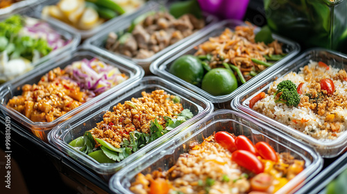 Fototapeta - Nowoczesne tajskie pudełka obiadowe w plastikowych opakowaniach kuszą intensywnymi kolorami i apetycznymi aromatami.