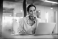 Smiling woman in office using laptop while holding glasses and working thoughtfully