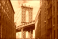 Brooklyn Bridge seen between two beautiful brown buildings at sunset