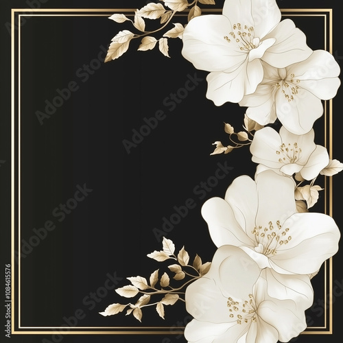 Fototapeta - Białe kwiaty w ramce na czarnym tle z miejscem na tekst, życzenia weselne