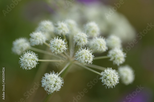 Fototapeta - Kwiaty jako rośliny lecznicze - szalej jadowity, dzięgiel litwor, (Angelica archangelica) na letniej, zielonej łące z kwiatami polnymi, tło, tapeta, do projektu