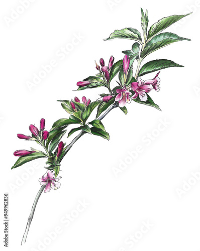 Fototapeta - Różowe kwiaty na gałęzi przezroczyste tło weigela branch