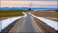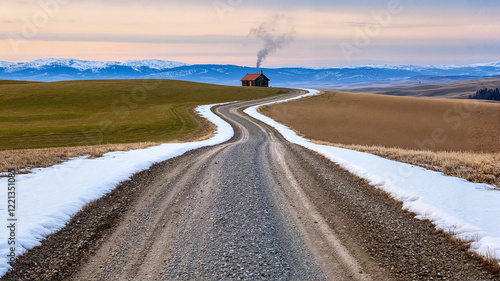 Fototapeta - Winding road leading to a cozy cabin in snowy landscape