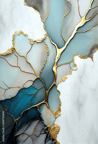 Fototapeta - Pintura abstrata em tons de azul claro e cinza claro arte de tinta de álcool ouro quebrado. Gerado IA