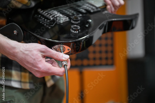 Fototapeta - Person plugging in electric guitar cable in recording studio