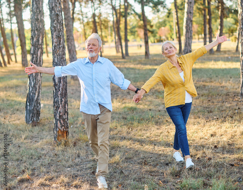 Fototapeta - Happy active senior couple meditating and daydreaming and relaxing and nature outdoors