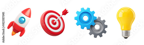 Start up Rocket, Setting , Target with Arrow , Light Bulb for Ideas , target landing web page. Business finance, Marketing goal success, target achievement concept. cartoon icon minimal. 3d render
