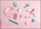 >Naklejka na meble>Tematy>3D>3d render realistic primitives composition. Flying shapes in motion isolated on pink background. Abstract theme for trendy designs. Spheres, torus, tubes, cones in metallic blue and pink colors.