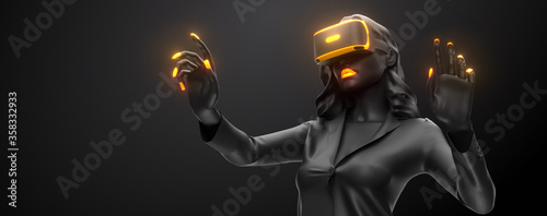 >Naklejka na meble>Tematy>3D>VR headset, online shopping. 3d render of the woman, wearing virtual reality glasses on black background. Woman buys a goods in one click. You will also find a EPS 10 for this image in my portfolio