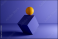 Yellow sphere or ball balanced at the edge of a cube geometric shape on blue background. Abstract 3D illustration.