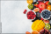 Fototapeta - Healthy raw rainbow fruits, mango papaya strawberries oranges passion fruits berries on oval serving plate on light kitchen top, top view, copy space, selective focus