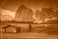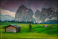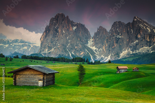 Summer alpine scenery with wooden houses on the field, Dolomites