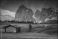 Fototapeta - Summer alpine scenery with wooden houses on the field, Dolomites