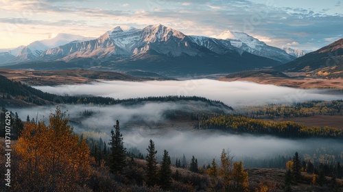 Fototapeta - A mountainous vista with fog rolling over the landscape, captured during the early morning in a remote, peaceful location.