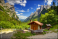 Fototapeta - Drewniany domek Włochy Alpy Dolomity wiosenna sceneria