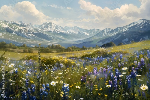 Malownicza łąka kwiatowa z widokiem na góry