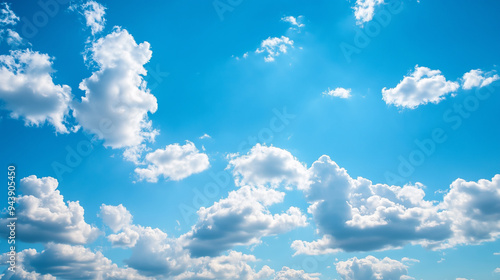 Fototapeta - Cudowne niebo wypełniają białe cumulusowe chmury, które unoszą się leniwie na tle spokojnego, błękitnego nieba.