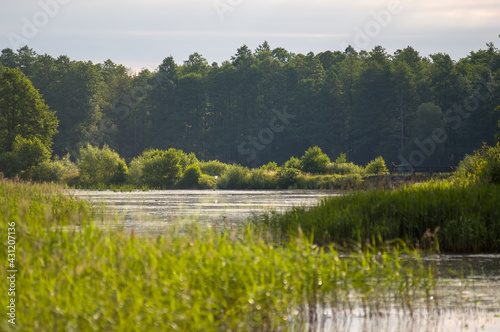 Fototapeta - Krajobraz z jeziorem i roślinnością ciągnącymi się po horyzont na tle pięknego nieba.