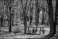 drewniany stół i ławki w lesie
