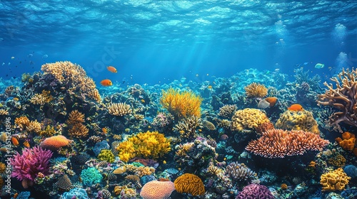 Vibrant coral reef teeming with fish. Sunlight streams through the water