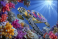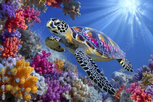 A turtle swims underwater in a vibrant coral reef surrounded by tropical marine life, as depicted by generative AI