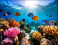 Vibrant coral reef teeming with diverse fish, bathed in sunlight
