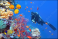 Scuba diver near beautiful coral reef surrounded with shoal of colorful coral fish and butterfly fish