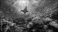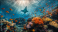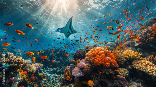 A vibrant coral reef underwater, showcasing a diverse array of colorful fish, corals, and a gliding manta ray under sunlight.
