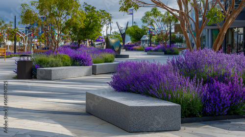 Modern urban plaza featuring lavender and purple plants in landscaped beds, contemporary city design, vibrant greenery, high-resolution,